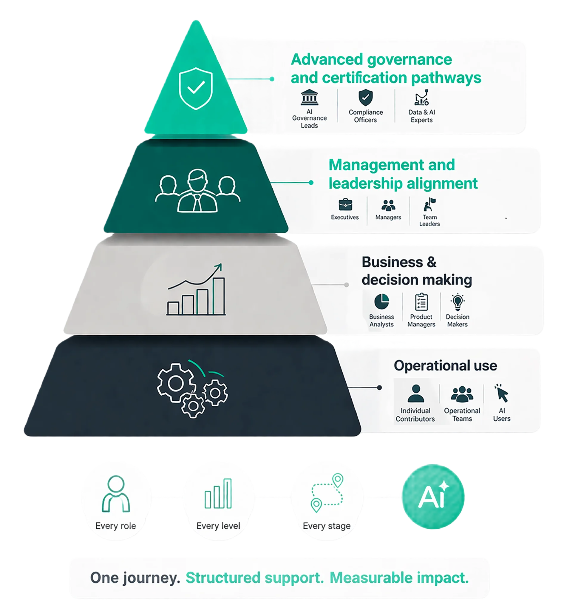 AI adoption needs different capabilities across your organisation. We support every role, every level, every stage of the journey.